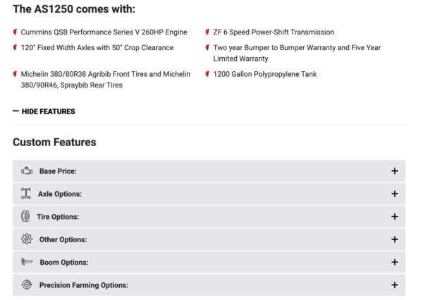 Choose the Apache Sprayer Model you like best, then customize your sprayer to the exact specifications needed, like tire options, boom options, precision upgrades, and more. This ensures that your quote is as personalized as possible to best meet your unique spraying needs.