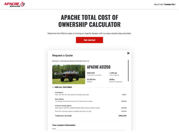 We know how important it is to understand the costs associated with purchasing vital equipment for your farm, so we’ve created a tool that allows you to easily determine the lifetime value of owning an Apache Sprayer. Our new, mobile-friendly Total Cost of Ownership calculator allows you to enter your unique information and specifications, then gives you a personalized report to better inform you on the savings you can expect when you upgrade to Apache.